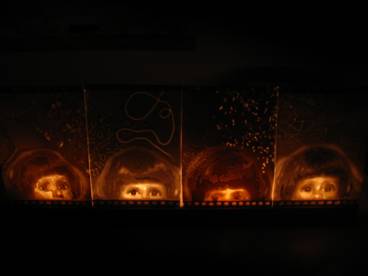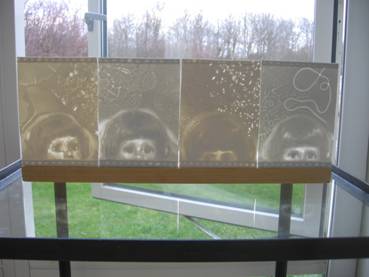 Well known technique of transferring photographs onto porcelain sheets by carving away layers of porcelain in different thicknesses.